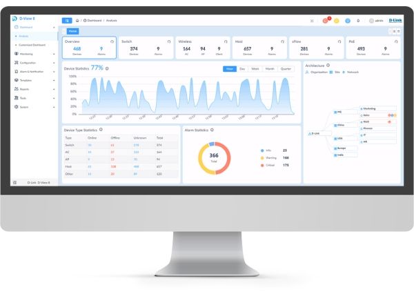 Real-time network analysis provides insight into network operations, where network visibility is extremely important. With D-View 8 you can gain insight on device statistics, critical alarms of managed devices, running status of wired and wireless devices, CPU/memory utilization, wired and wireless throughput of devices.